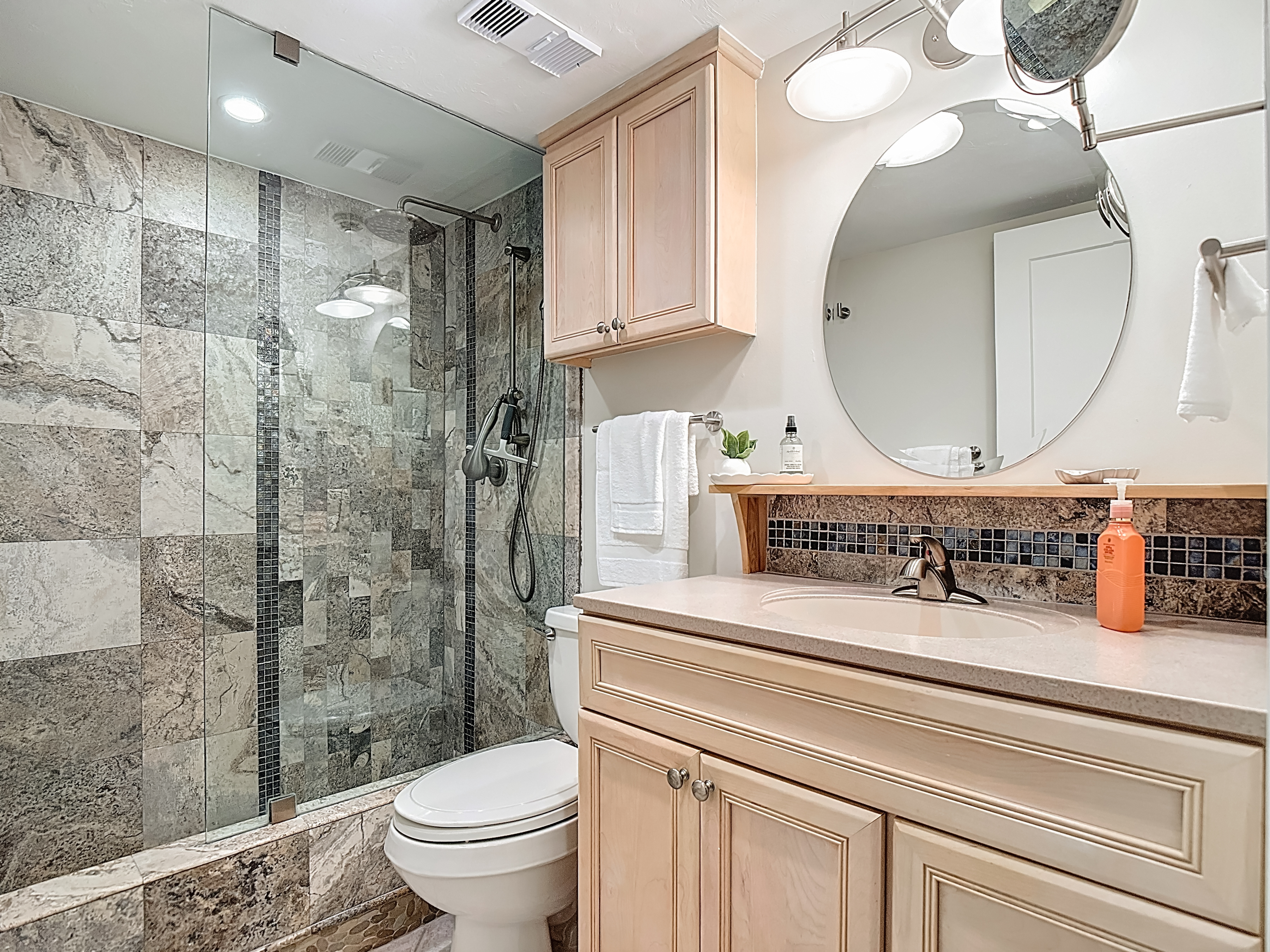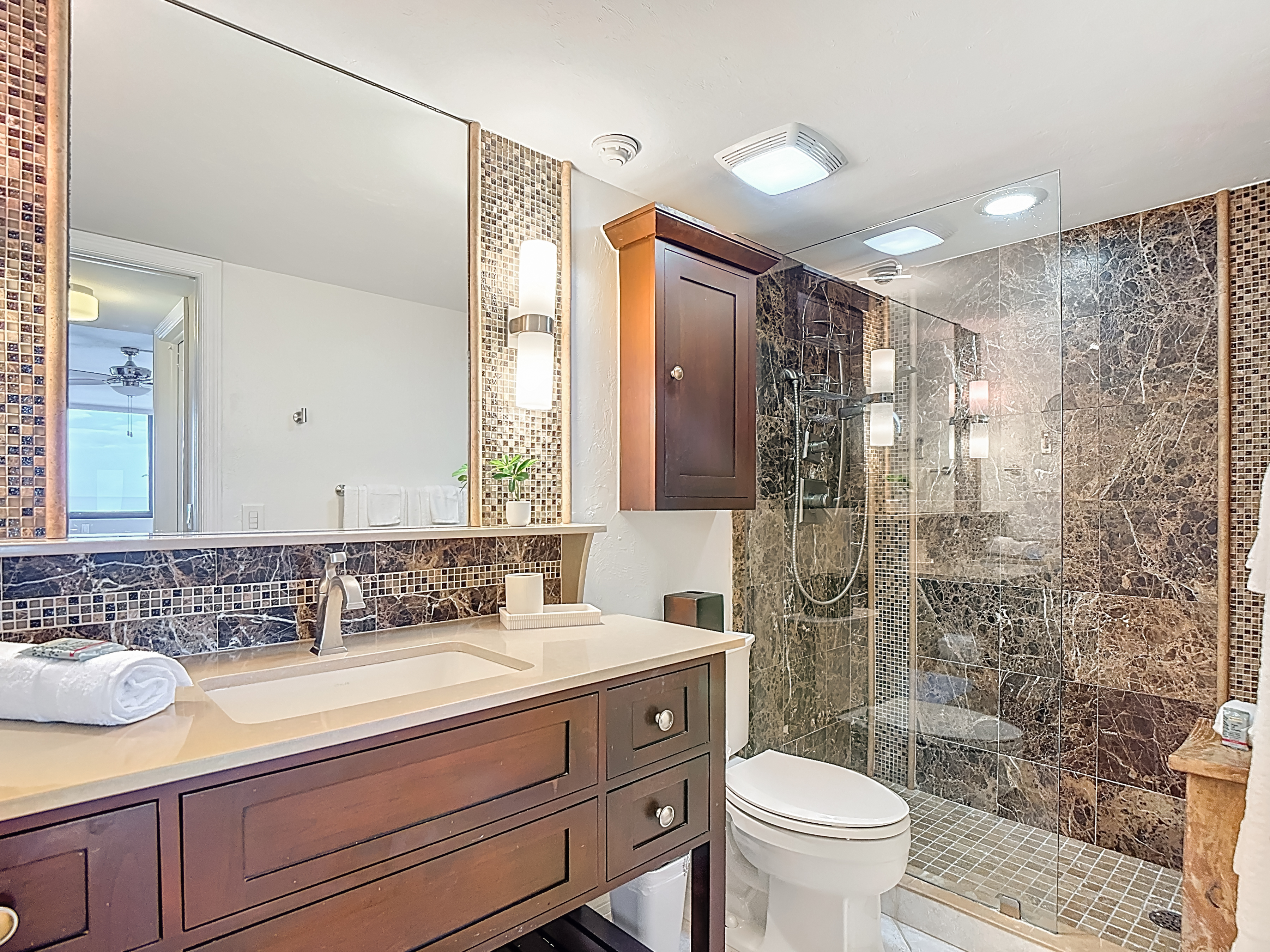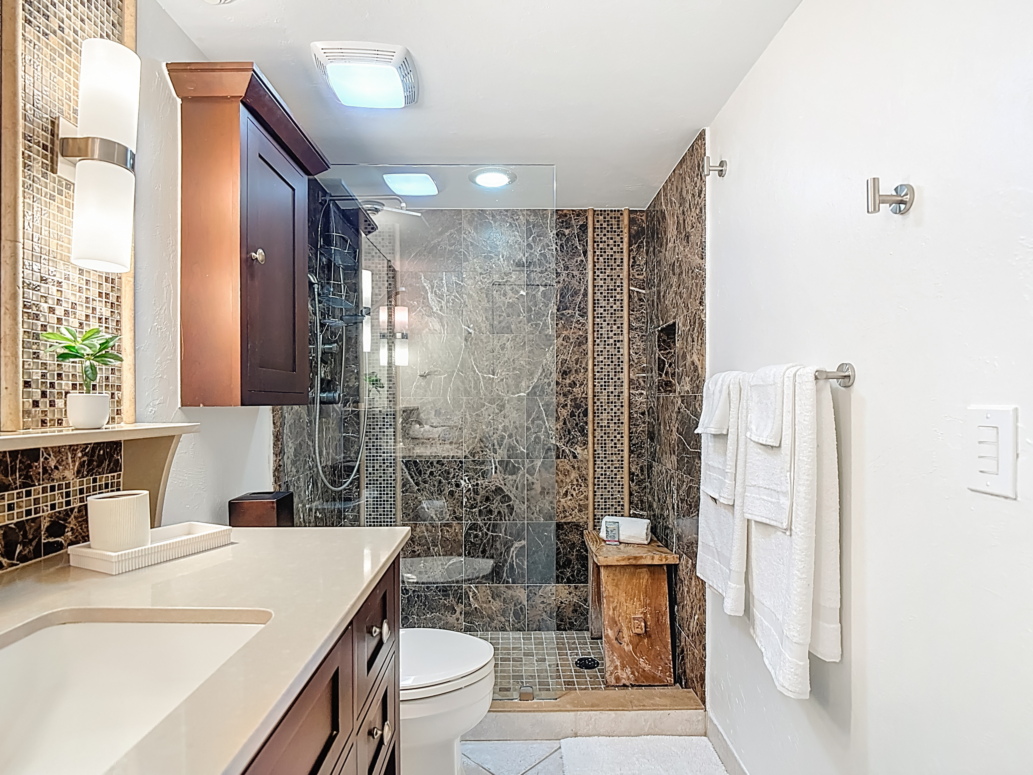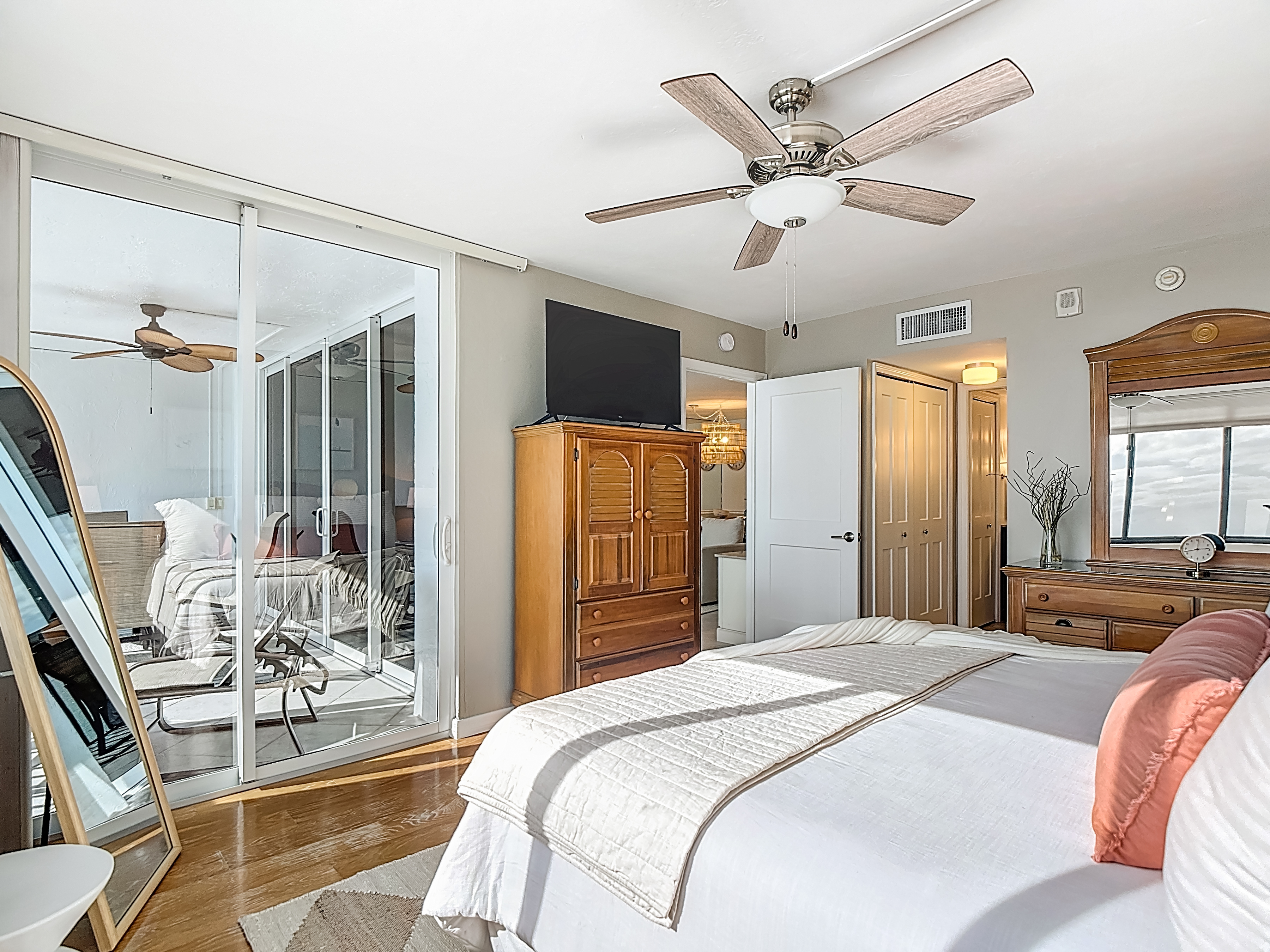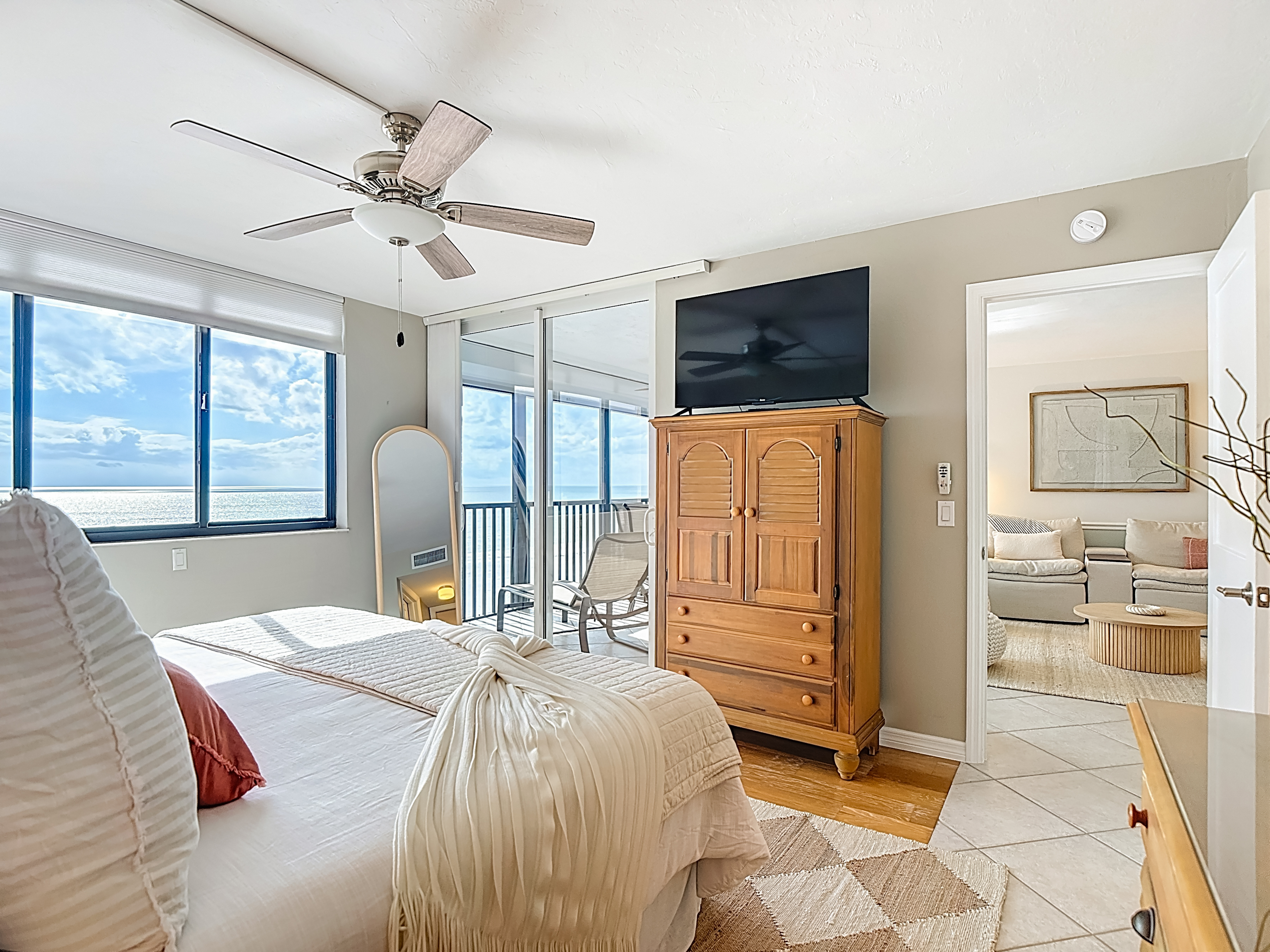 - The primary bedroom is a serene retreat designed with comfort and relaxation in mind. It features a luxurious king-size bed, a large dresser, a spacious armoire, and nightstand lamps with built-in charging ports. Enjoy the convenience of a smart TV (HDR Smart ROKU – 43”), generous closet space, and private balcony access through sliding glass doors. The en-suite bathroom offers a beautifully designed vanity with open shelving above and ample storage below, along with a stunning tiled walk-in shower— creating a spa-like experience to begin and end your day