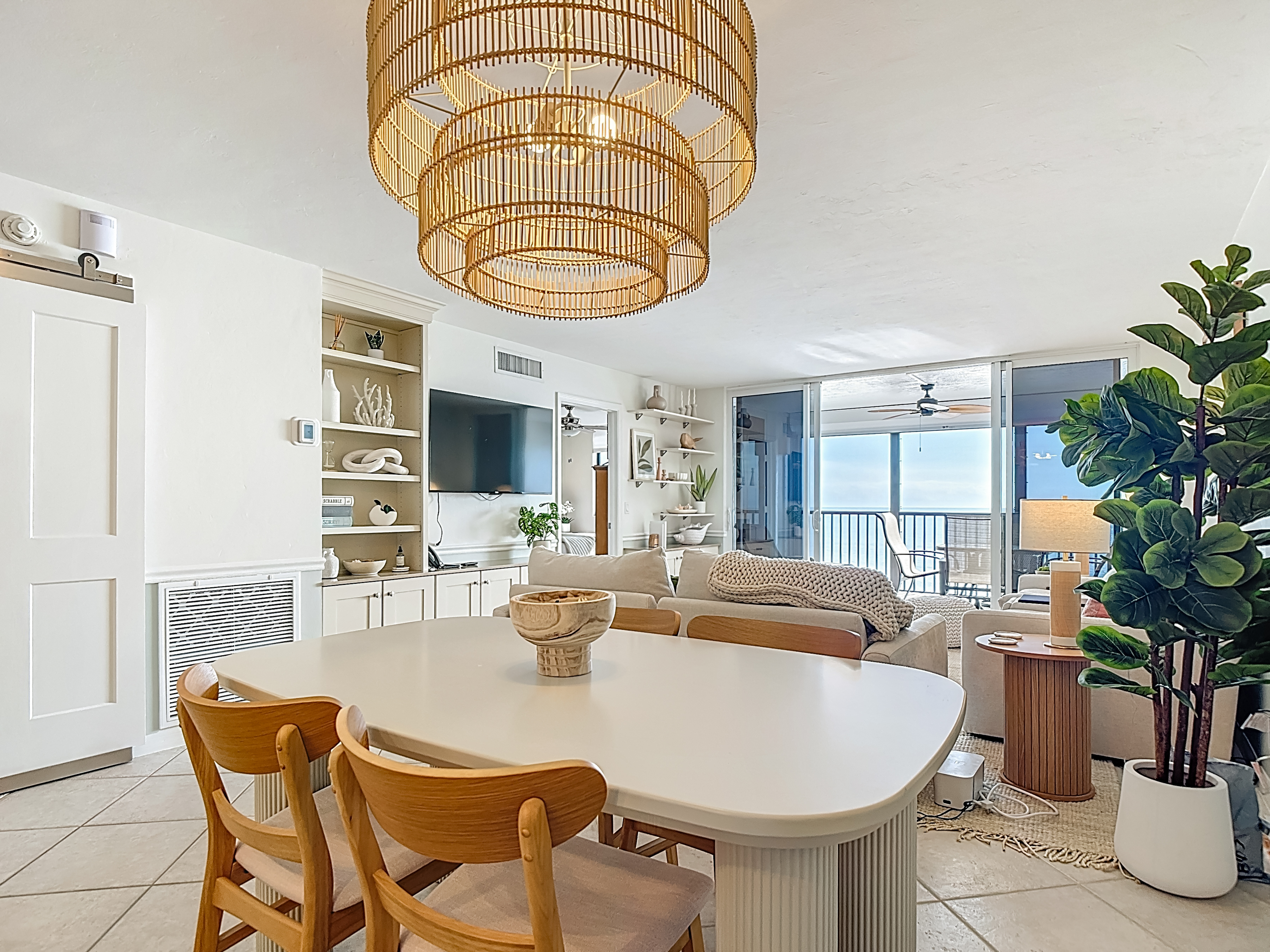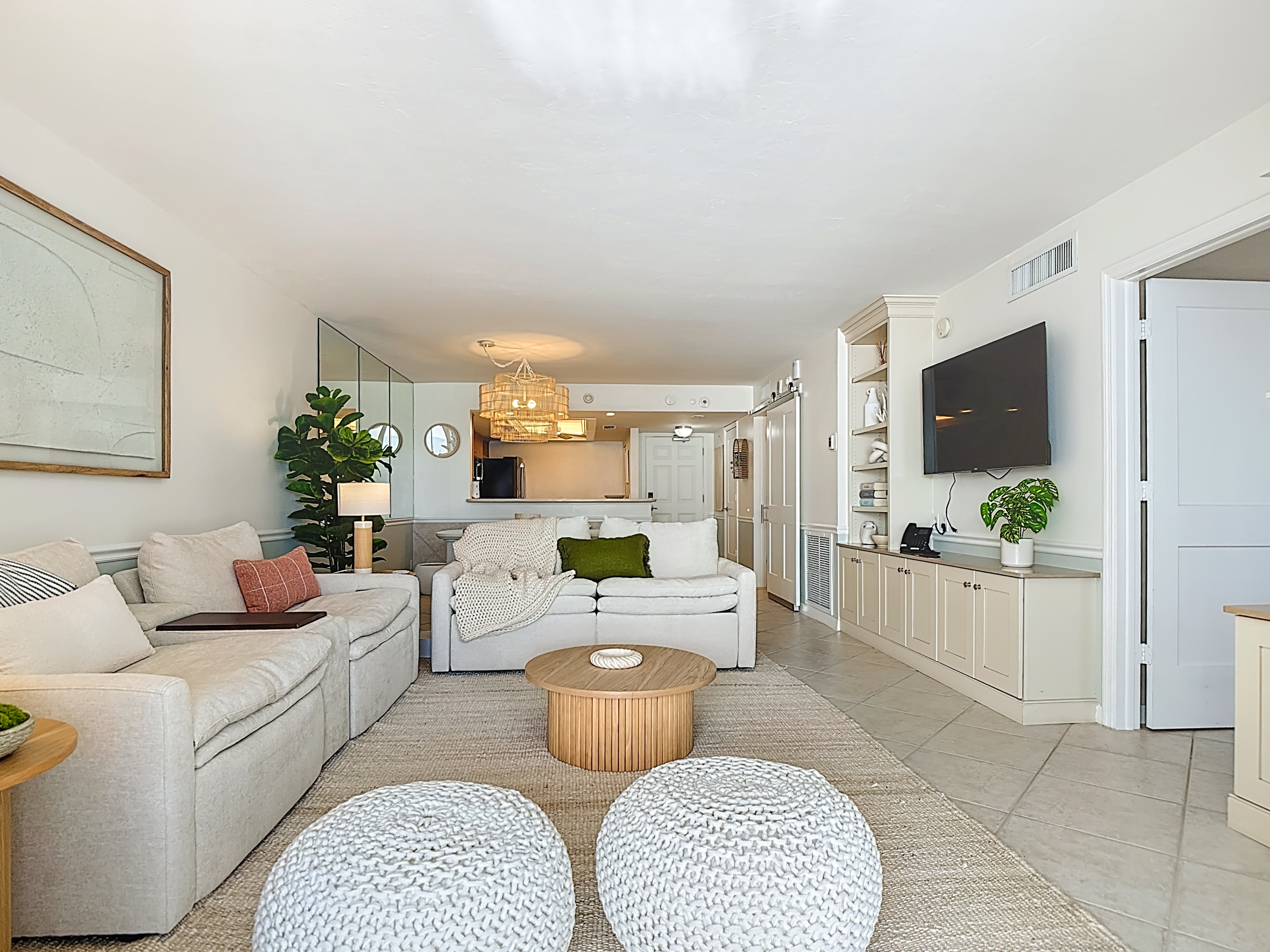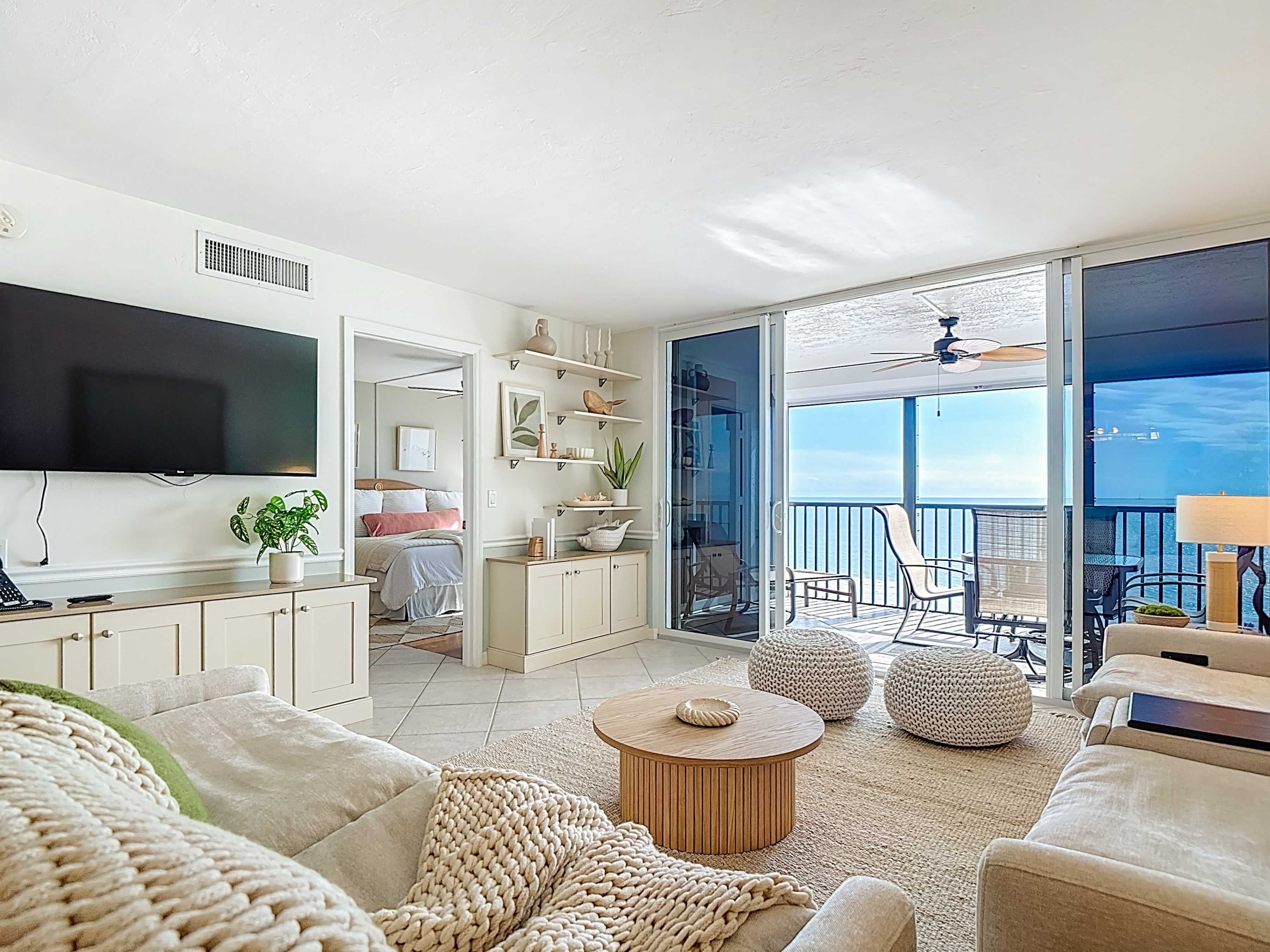 Entering the condo, you are welcomed into an open-concept kitchen, dining, and living area, perfectly arranged for both relaxation and entertaining. The kitchen features corian countertops, stainless steel appliances, custom cabinetry, and everything needed for dining in. A sliding barn door off the guest bedroom provides added privacy and a stylish touch. The living room is beautifully furnished with power-reclining seating, curated décor, and sliding glass doors leading to the screened-in balcony overlooking the resort pool, the beach, and the Gulf of Mexico beyond—an ideal spot to enjoy morning coffee or evening sunsets.
