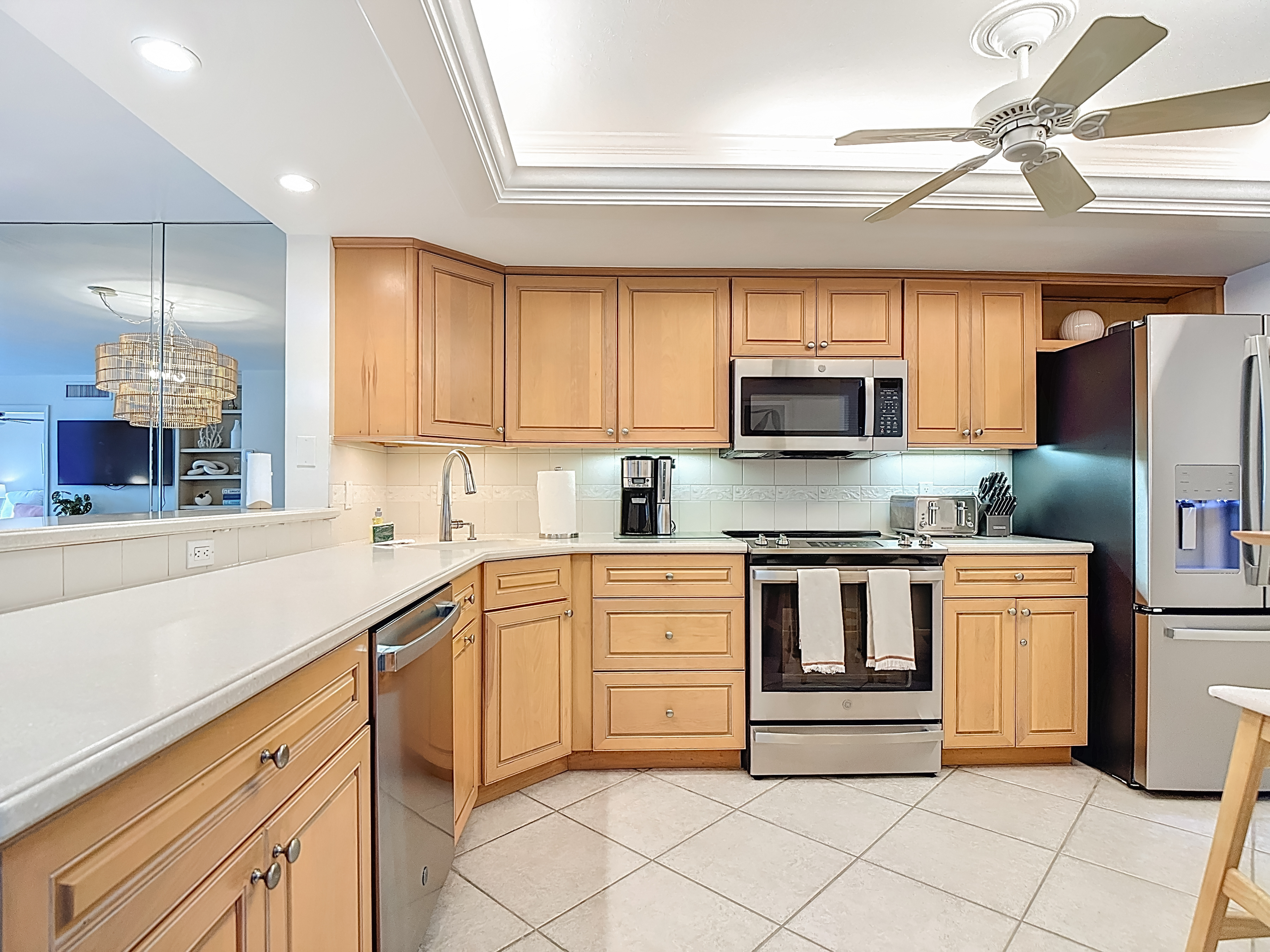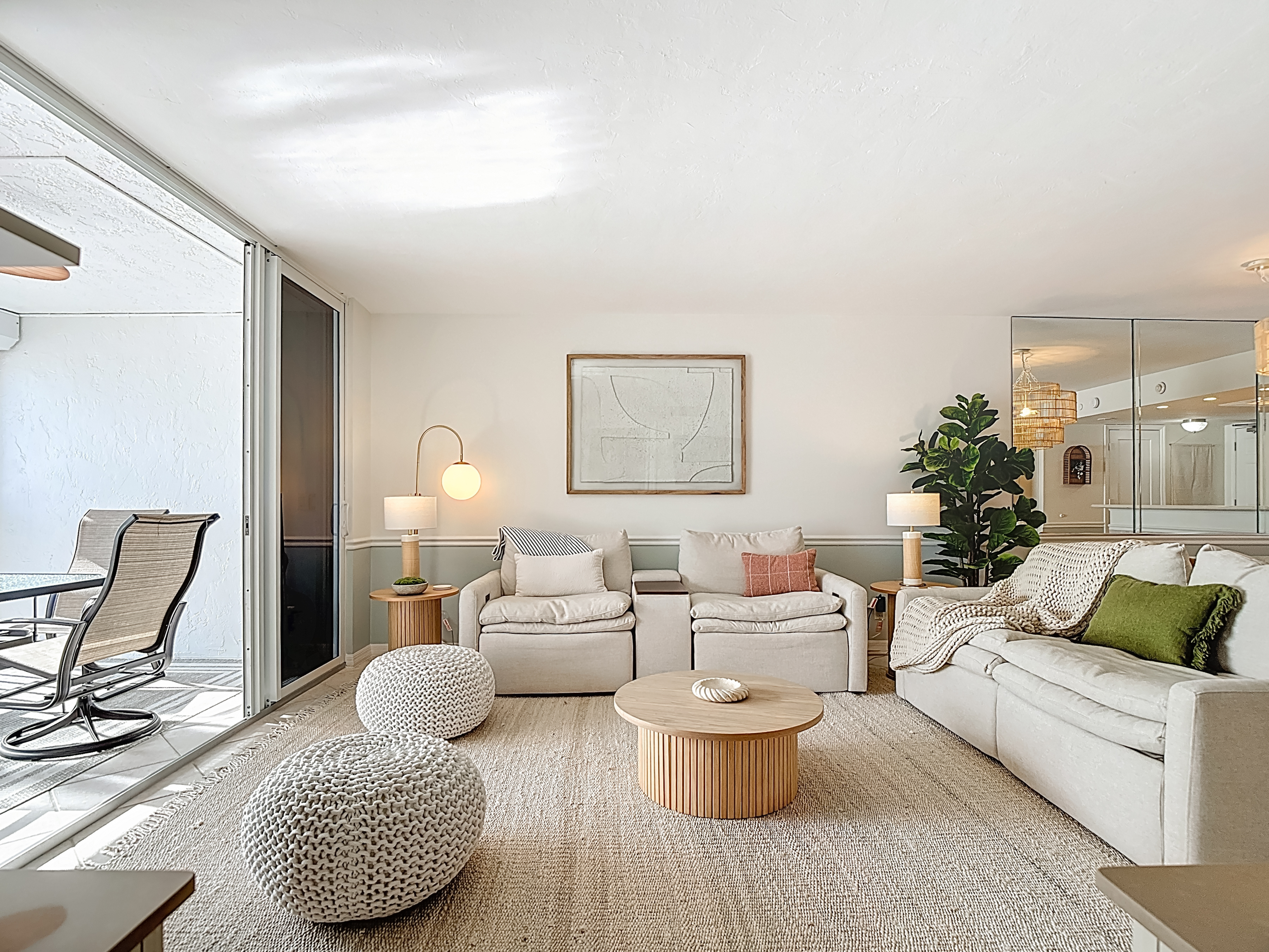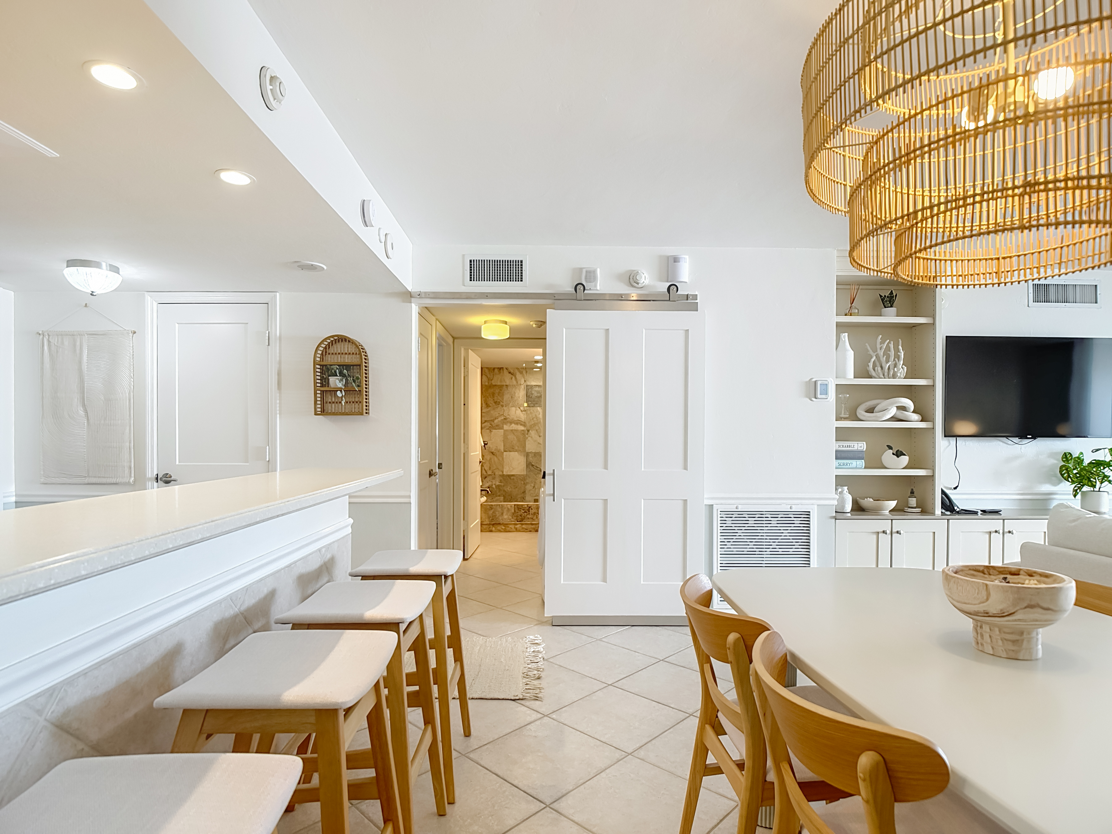 Entering the condo, you are welcomed into an open-concept kitchen, dining, and living area, perfectly arranged for both relaxation and entertaining. The kitchen features corian countertops, stainless steel appliances, custom cabinetry, and everything needed for dining in. A sliding barn door off the guest bedroom provides added privacy and a stylish touch. The living room is beautifully furnished with power-reclining seating, curated décor, and sliding glass doors leading to the screened-in balcony overlooking the resort pool, the beach, and the Gulf of Mexico beyond—an ideal spot to enjoy morning coffee or evening sunsets.