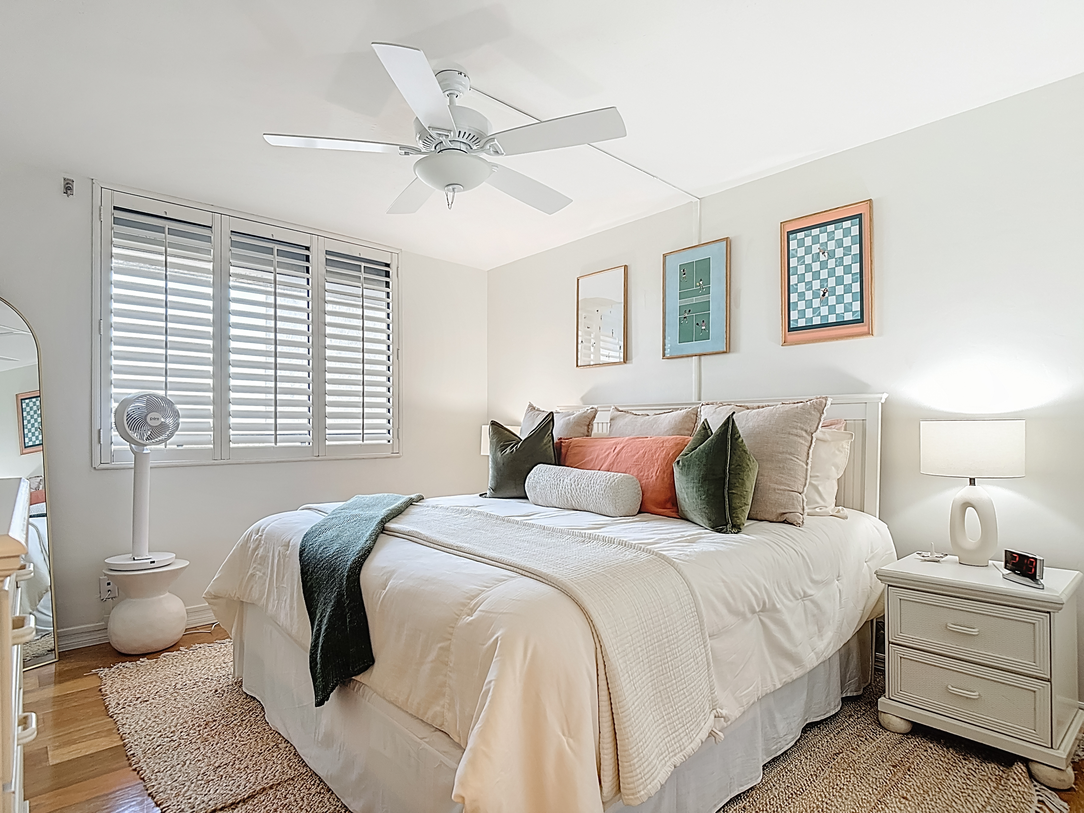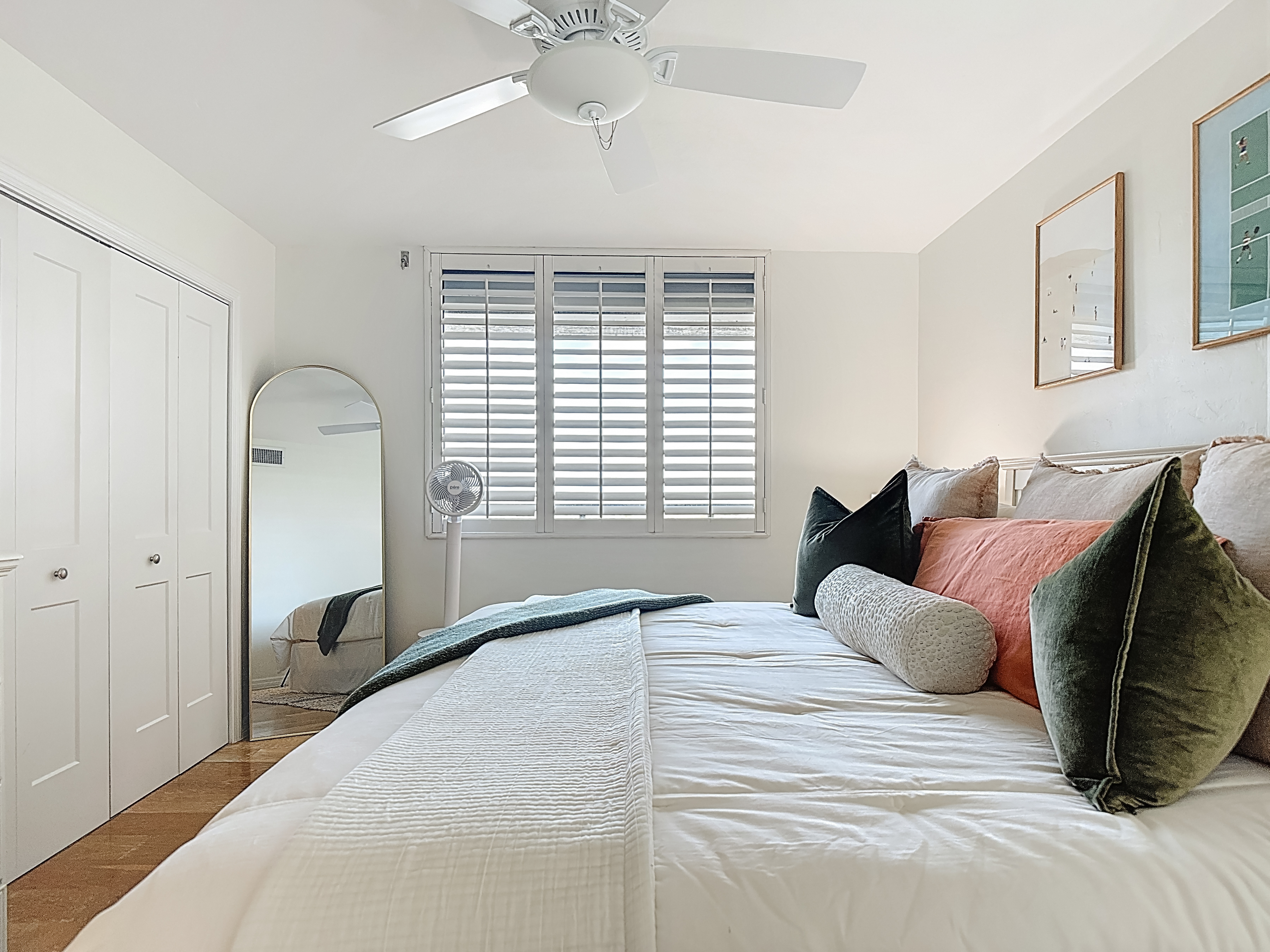 - The guest bedroom is thoughtfully appointed to provide comfort and convenience for visitors. It features a plush king-size bed, a smart TV (HDR Smart ROKU – 43”), and generous closet space. Guests enjoy easy access to the nearby bathroom, which includes a spacious vanity with ample storage and a custom tub/shower combination-perfect for unwinding after a day at the beach.