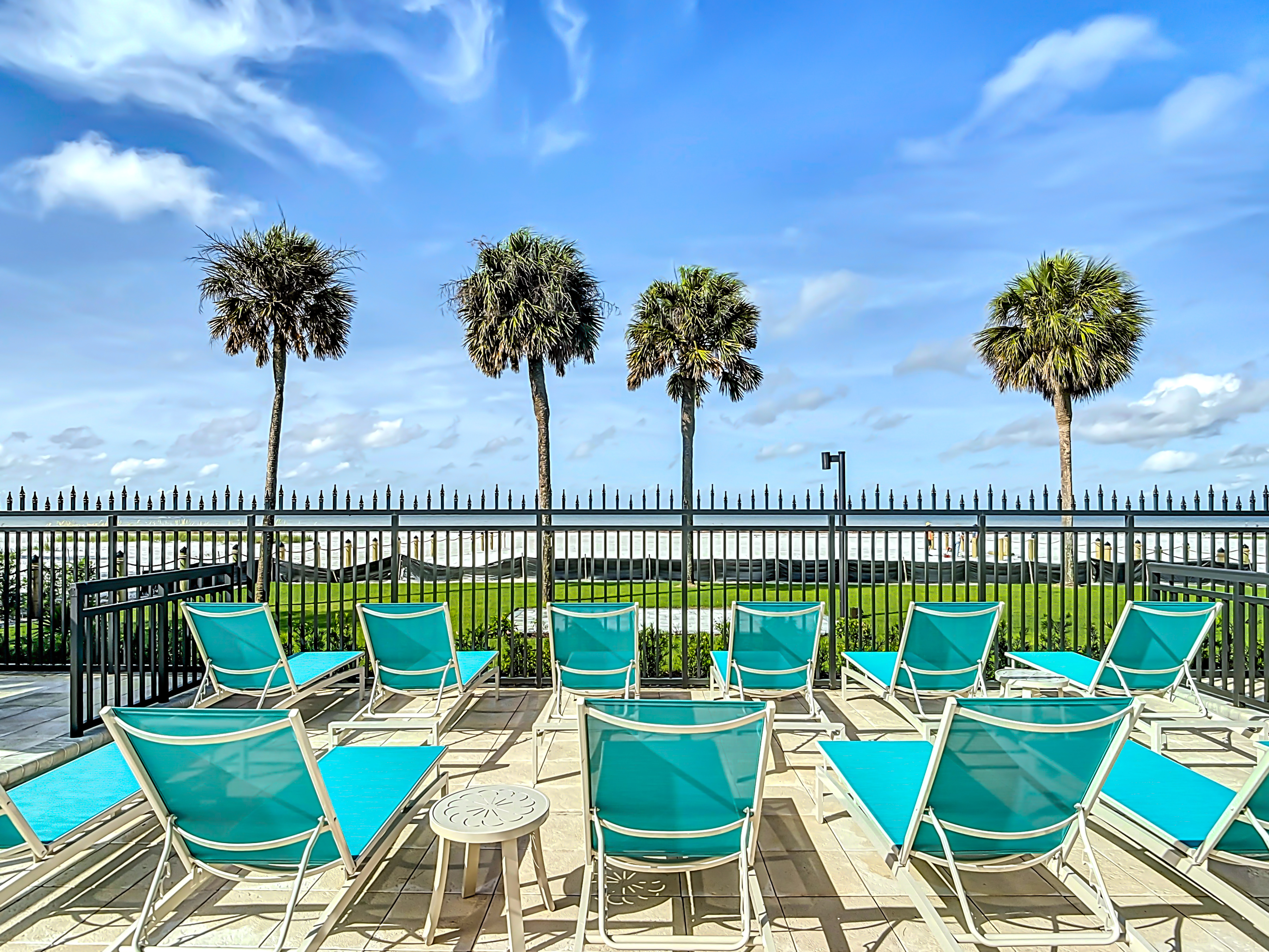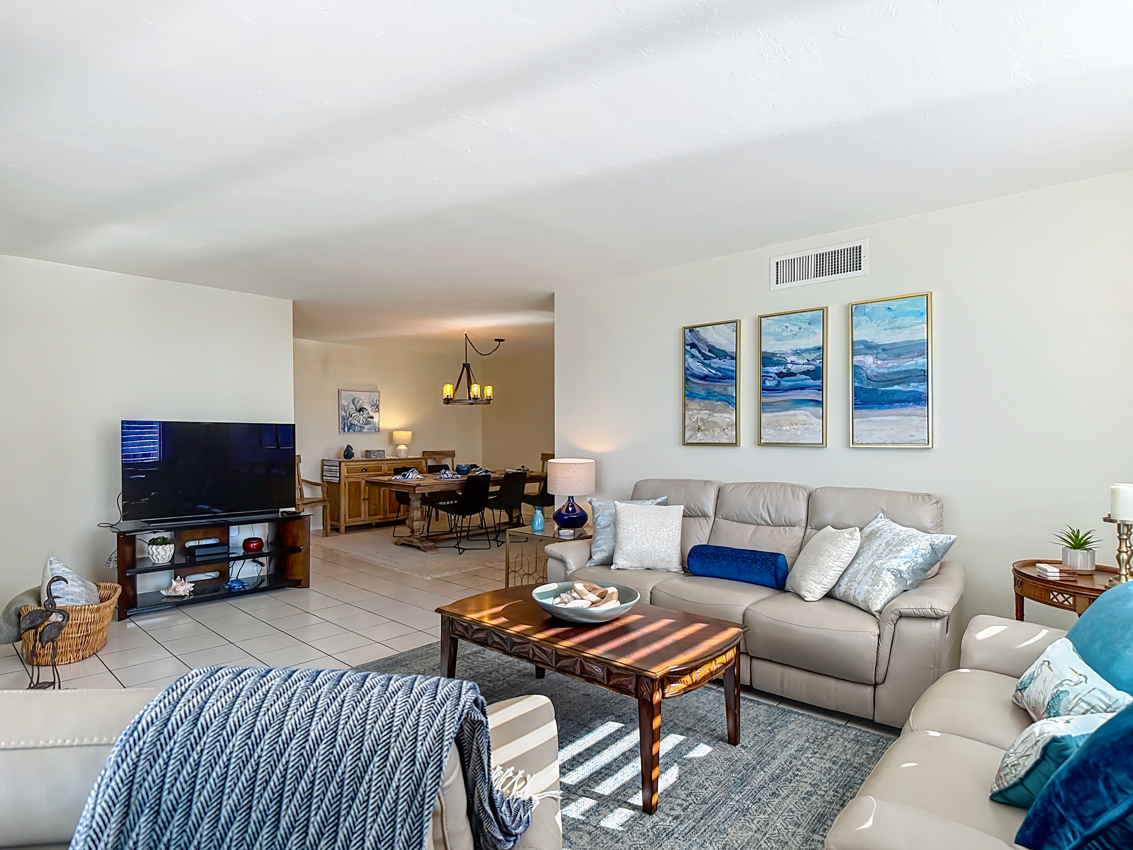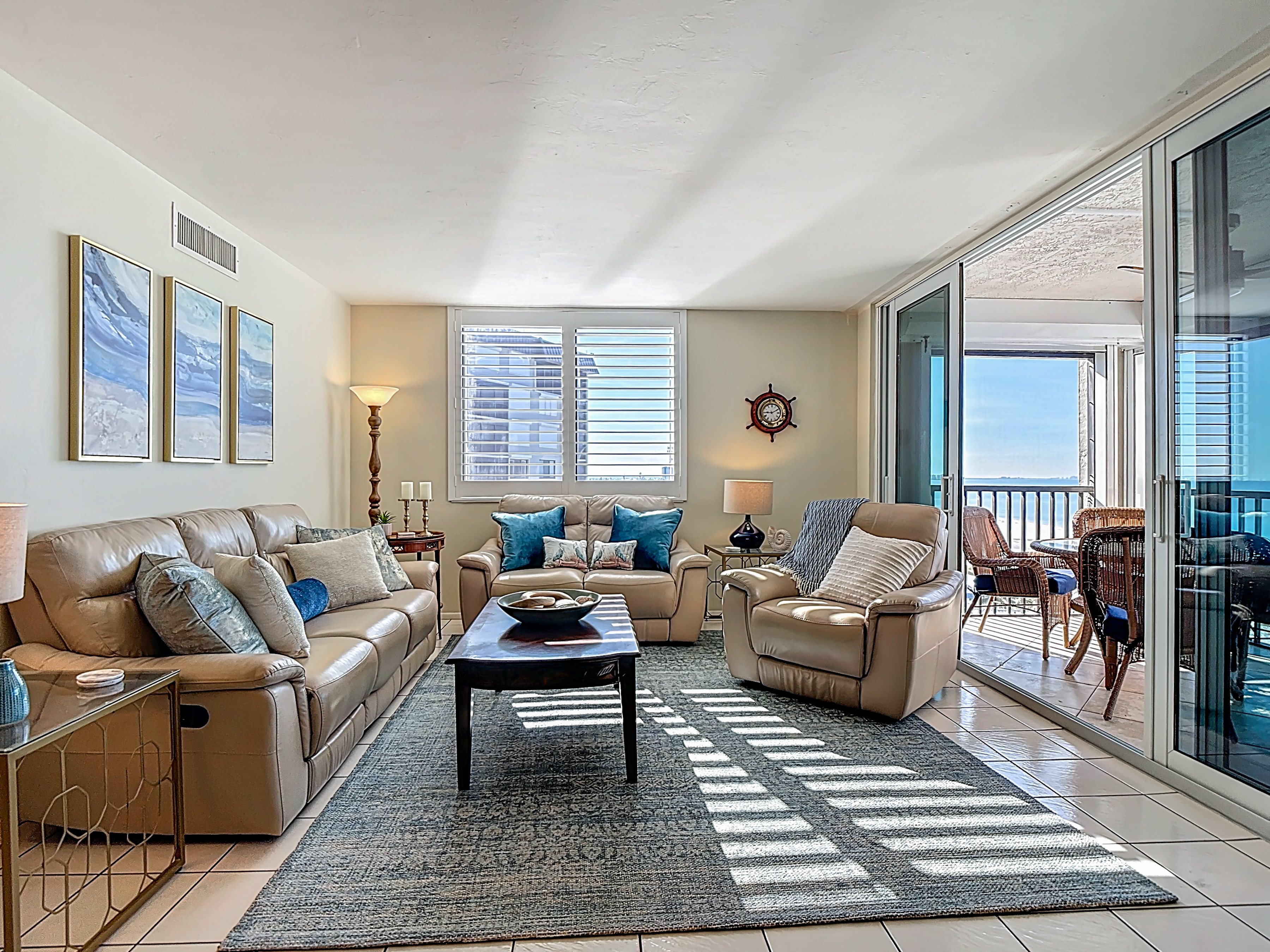 As you step further into the unit you will find an inviting living room. The living area is a sanctuary of comfort and style, featuring a comfortable leather couch and furnishings arranged to optimize both relaxation and conversation. Here you can enjoy the large screen smart T.V. set. You may not ever want to watch T.V. because steps away is screened-in lanai. Open the glass doors to find lounge chairs and a table. The higher-up corner unit is perfect for watching dolphins and/or the sunset.