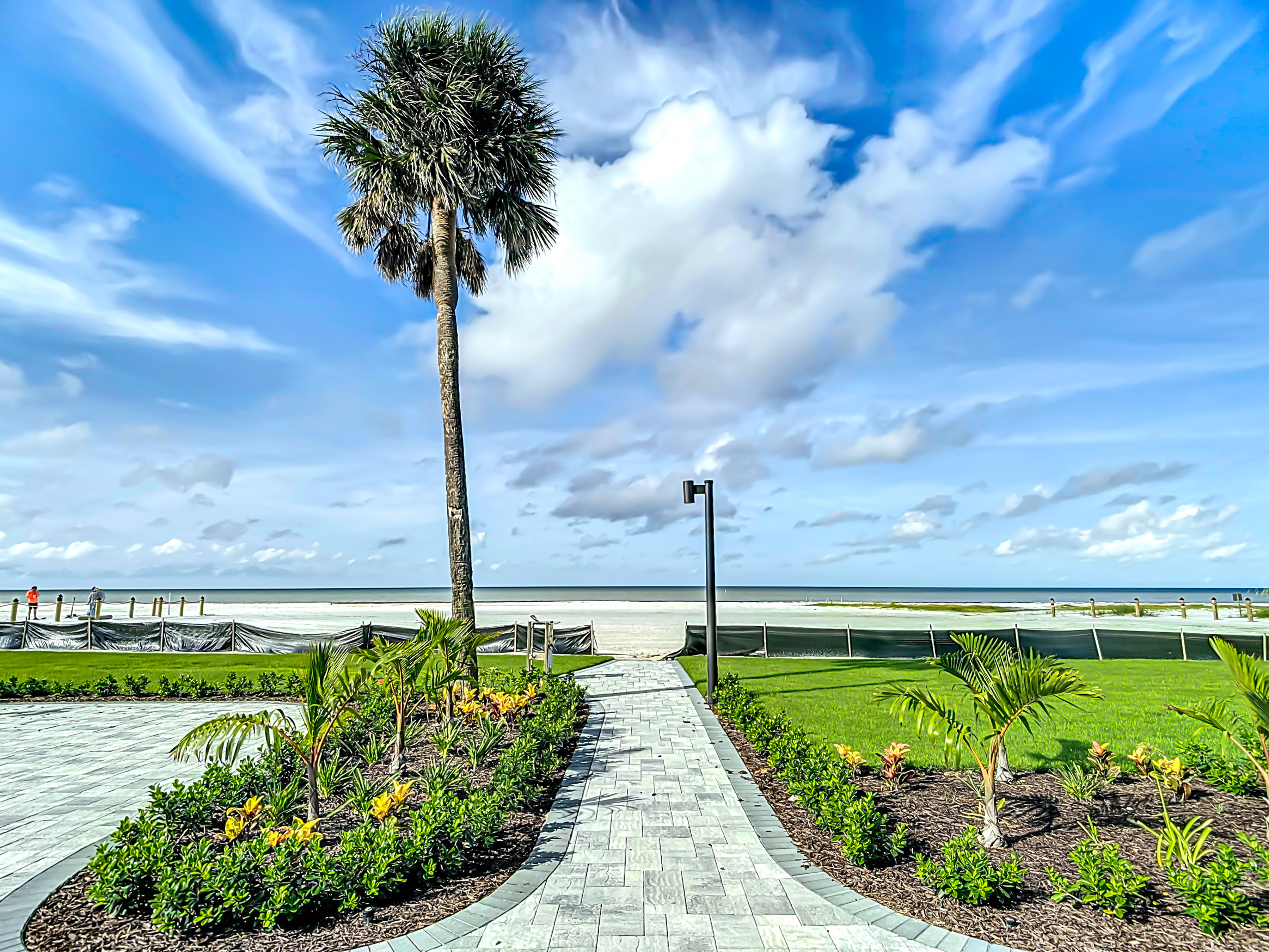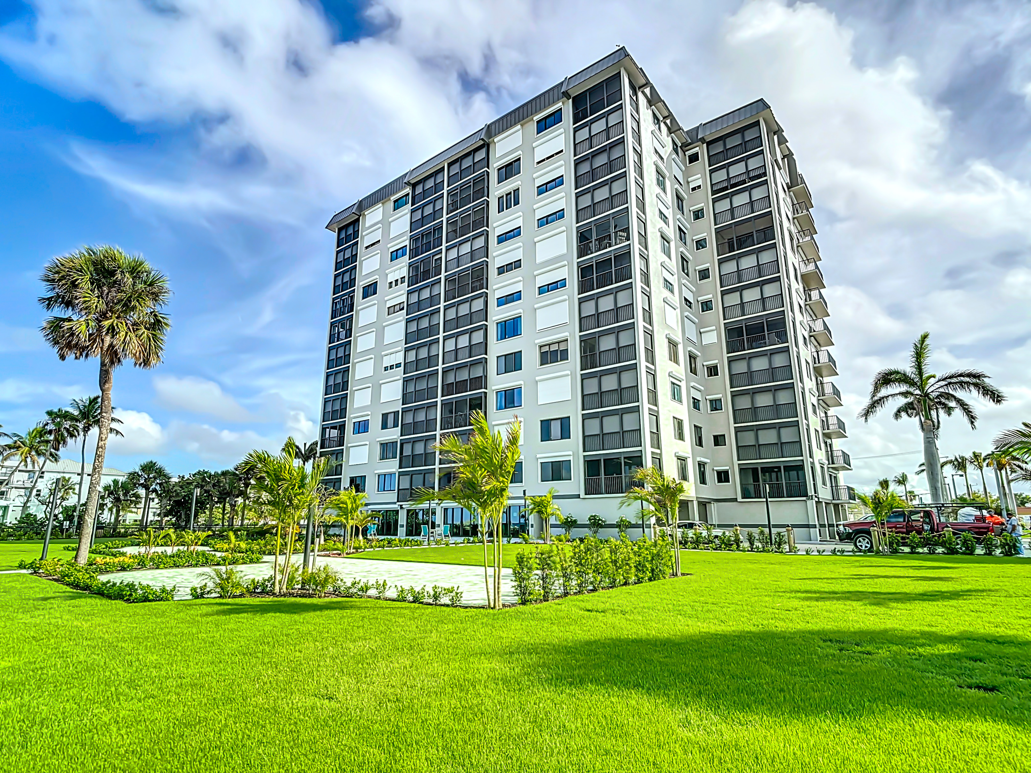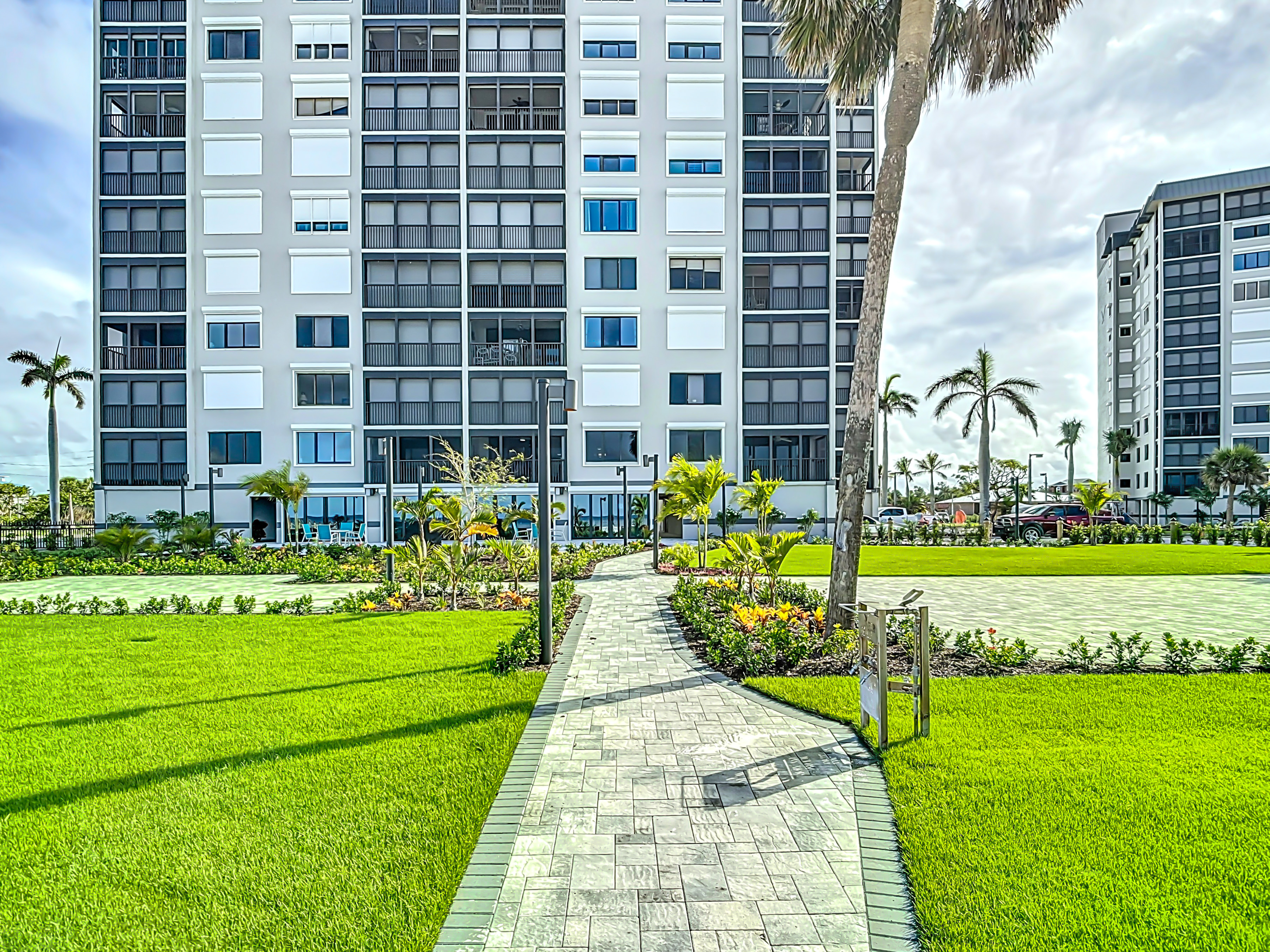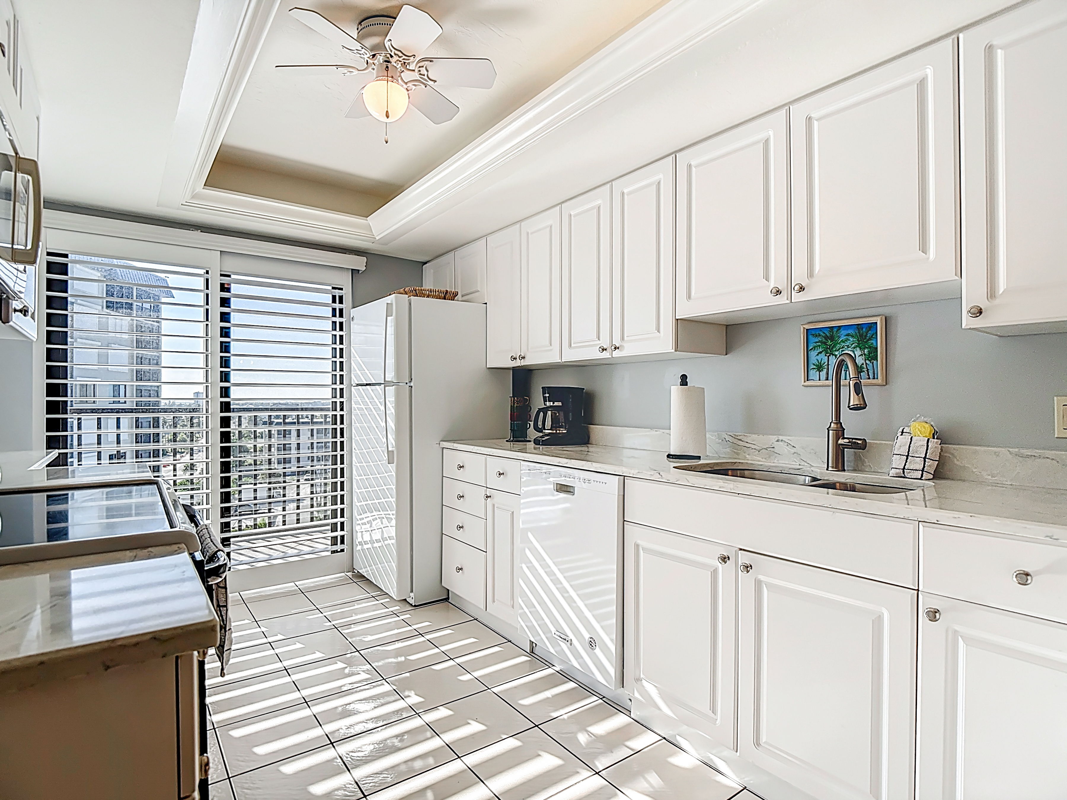 As you step further into the unit you will find an inviting living room. The living area is a sanctuary of comfort and style, featuring a comfortable leather couch and furnishings arranged to optimize both relaxation and conversation. Here you can enjoy the large screen smart T.V. set. You may not ever want to watch T.V. because steps away is screened-in lanai. Open the glass doors to find lounge chairs and a table. The higher-up corner unit is perfect for watching dolphins and/or the sunset.