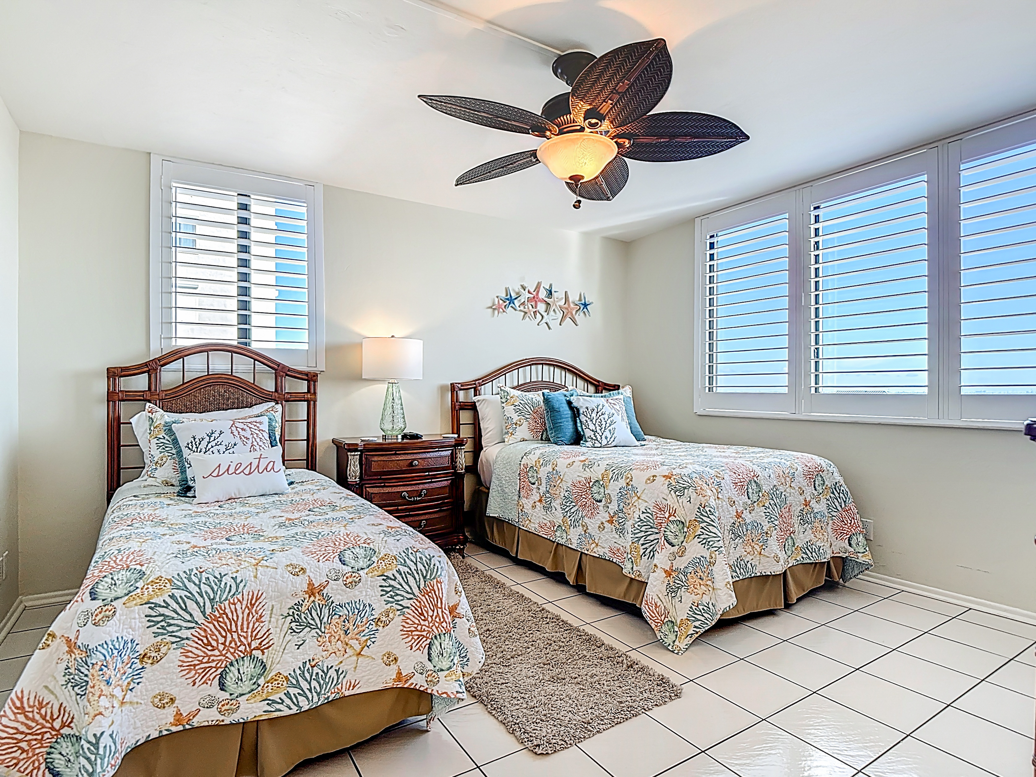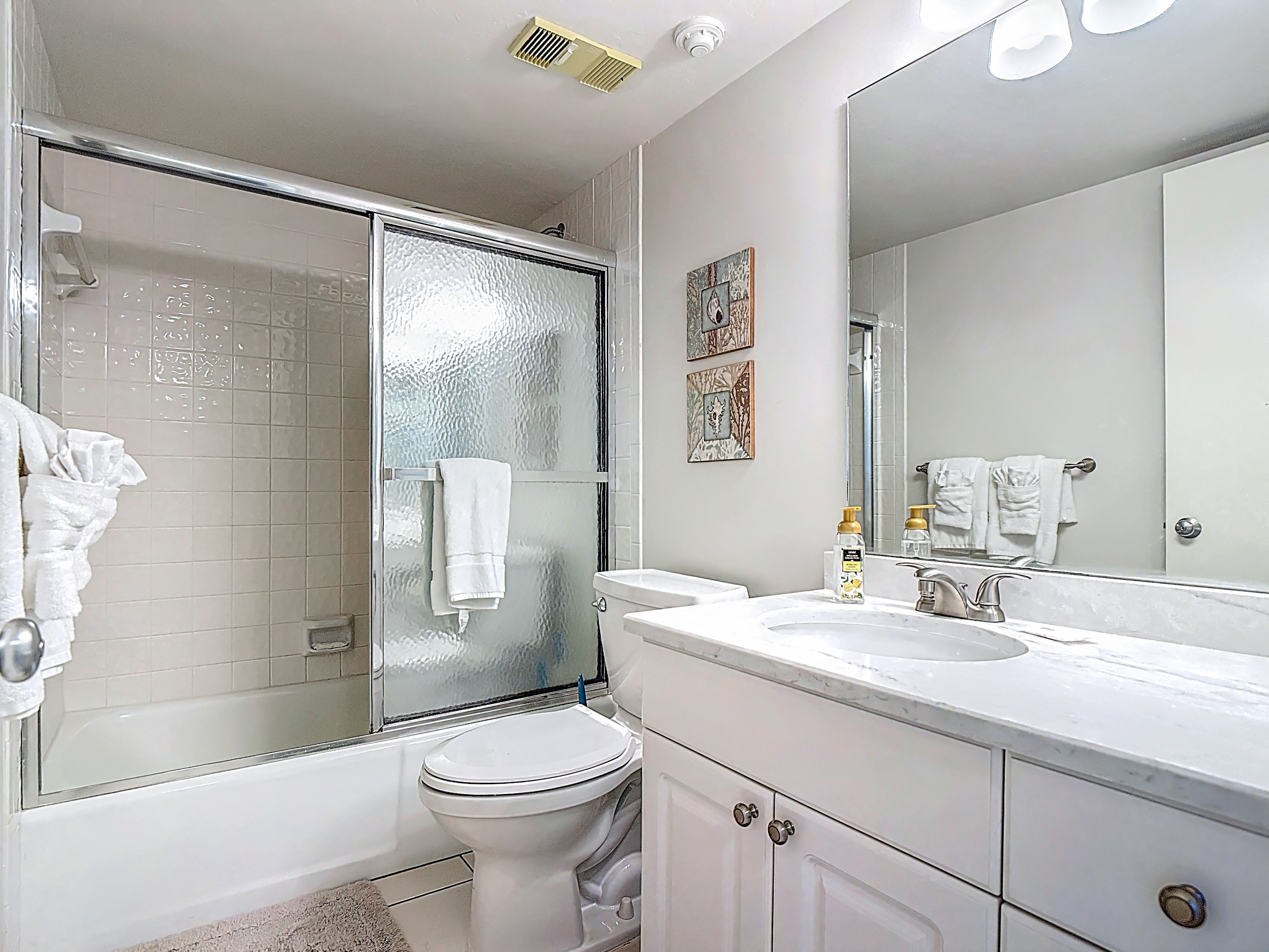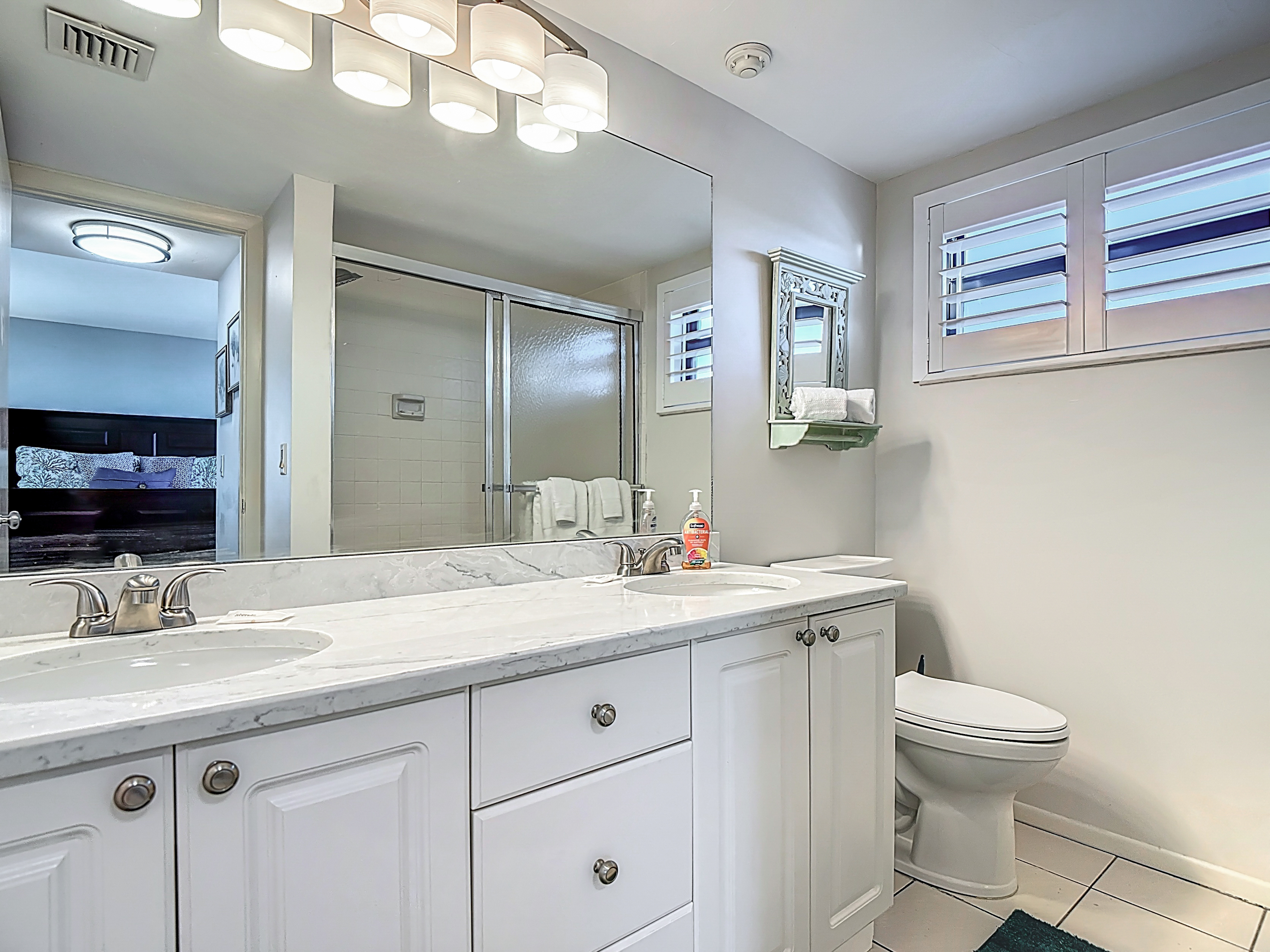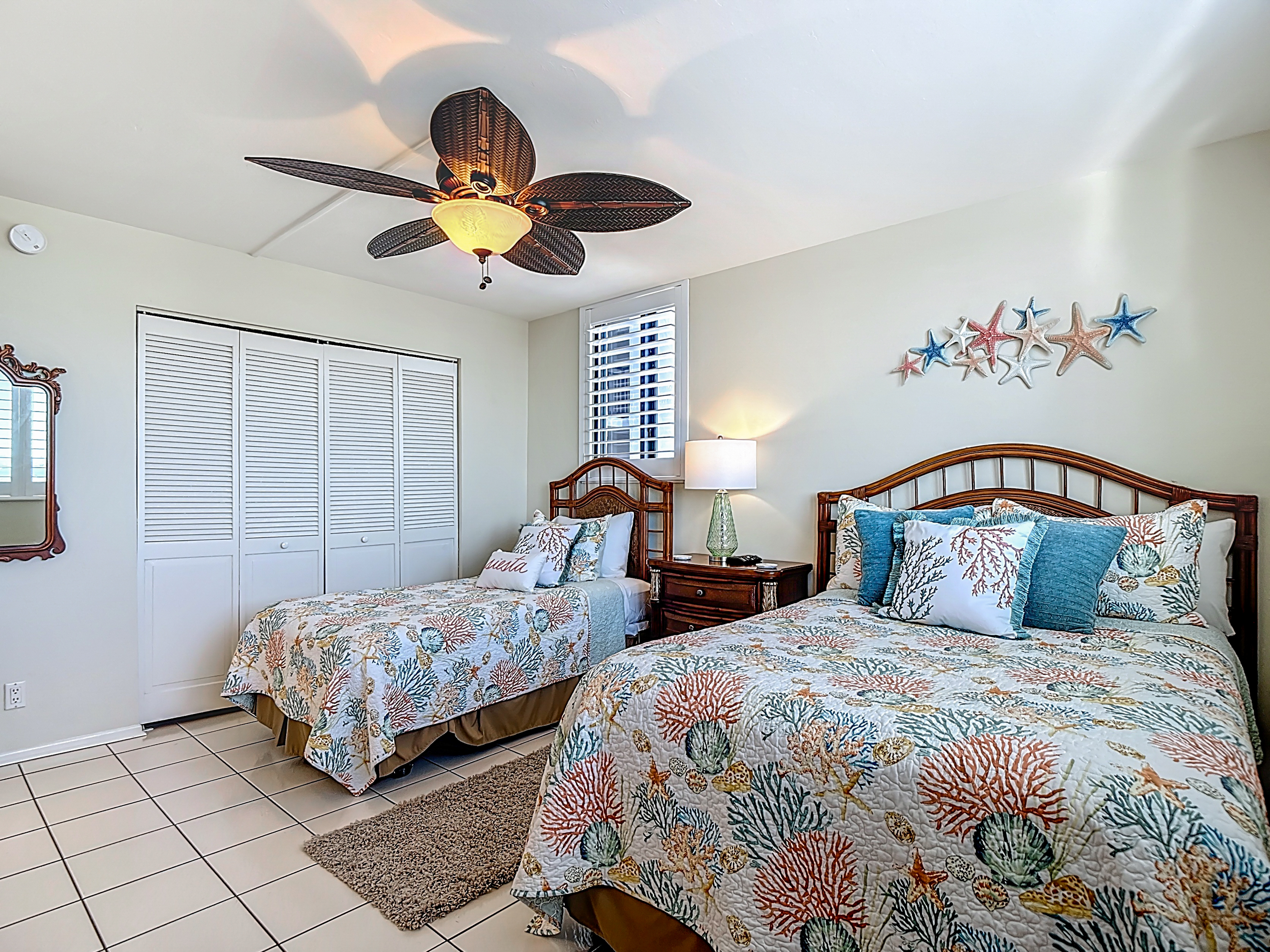 The guest bedroom has 1 twin bed and 1 full-sized bed. There are dressers and a large closet for your clothes. Next to the guest bedroom is a bathroom with its own shower and bath. There is a linen closet next to the bathroom that has beach towels, sheet, extra towels and even an iron and ironing board. The hallway that connects both bedrooms has a new washer and dryer. The washer is extra deep to handle beach towels and sheets.