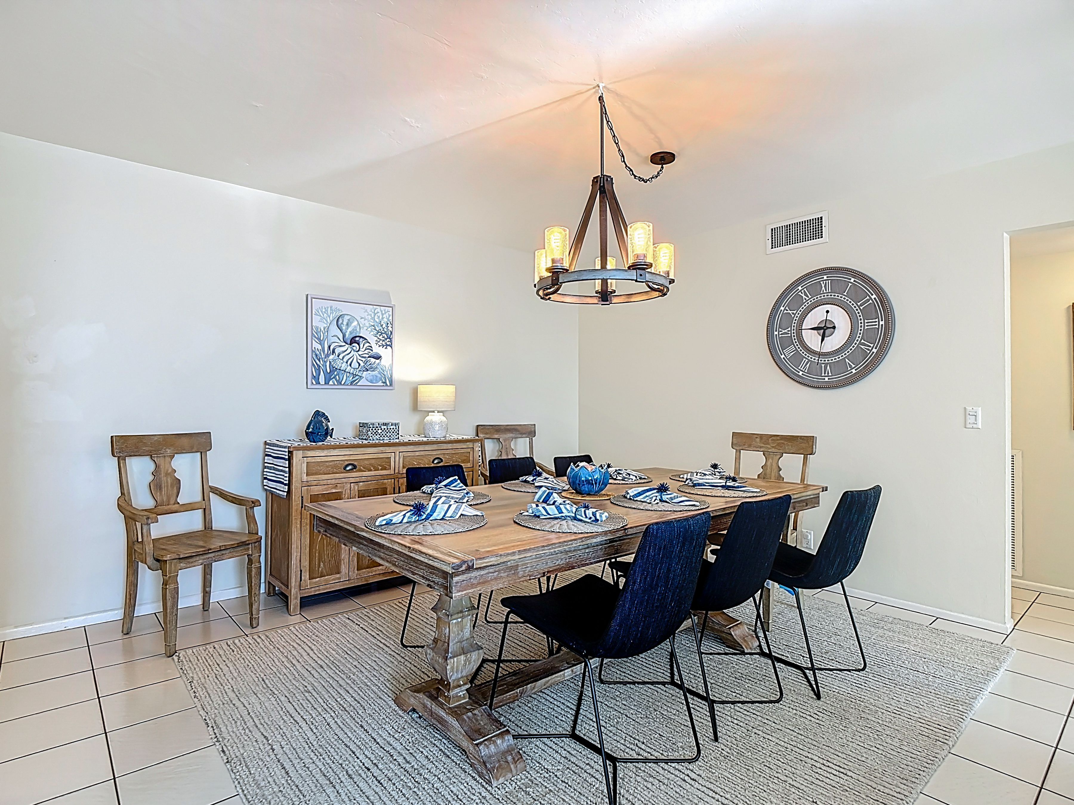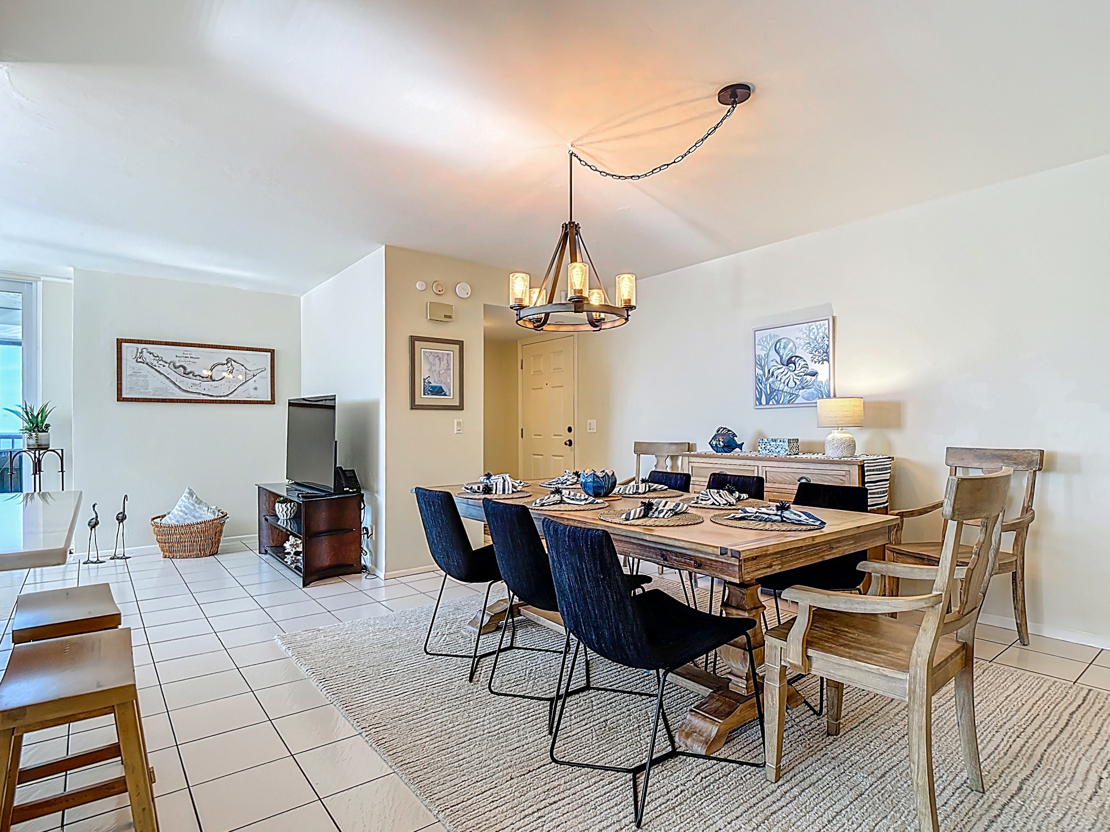 This 8th-floor corner unit perched gracefully along the coastline, where every glance offers a panoramic view of the endless ocean stretching out before you. As you enter, there is a comfortable dining area consisting of a 6 person dining room and chairs. Choose to keep it casual or dress it up with beautiful table linens kept in a dining room cabinet. There are wine glasses, champagne flutes or beer mugs that can be used at your disposal.