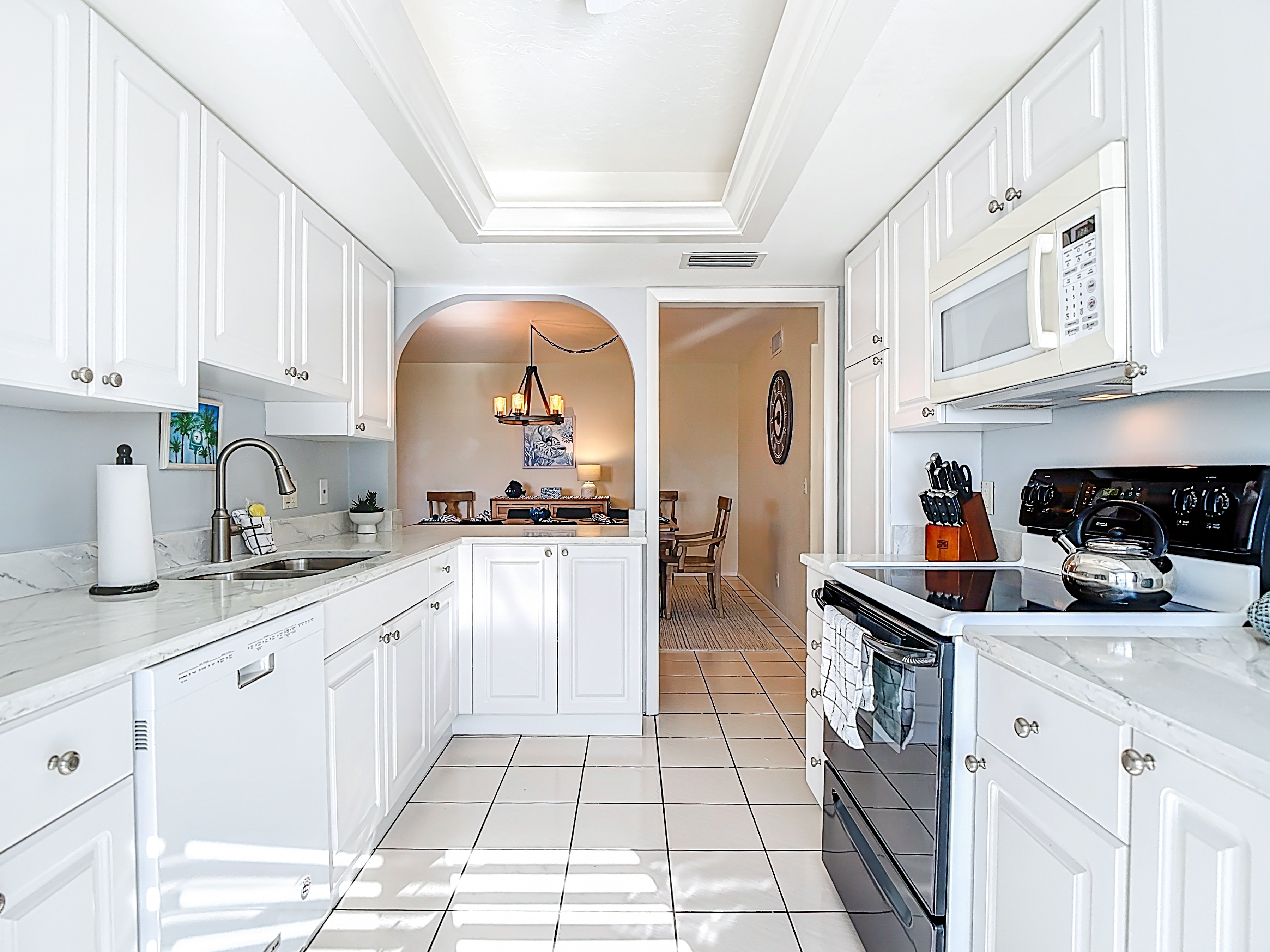 The kitchen is nice sized with newer stove, refrigerator and microwave. Everything you would ever need during your stay is available including baking sheets, newer pots and pans, coffee maker, kitchen towels, apron, pizza stone, and more. Whether you're whipping up a quick snack or preparing a culinary masterpiece, the kitchen is well-equipped. Also, there is a balcony right off the kitchen which offers a breath of fresh air.